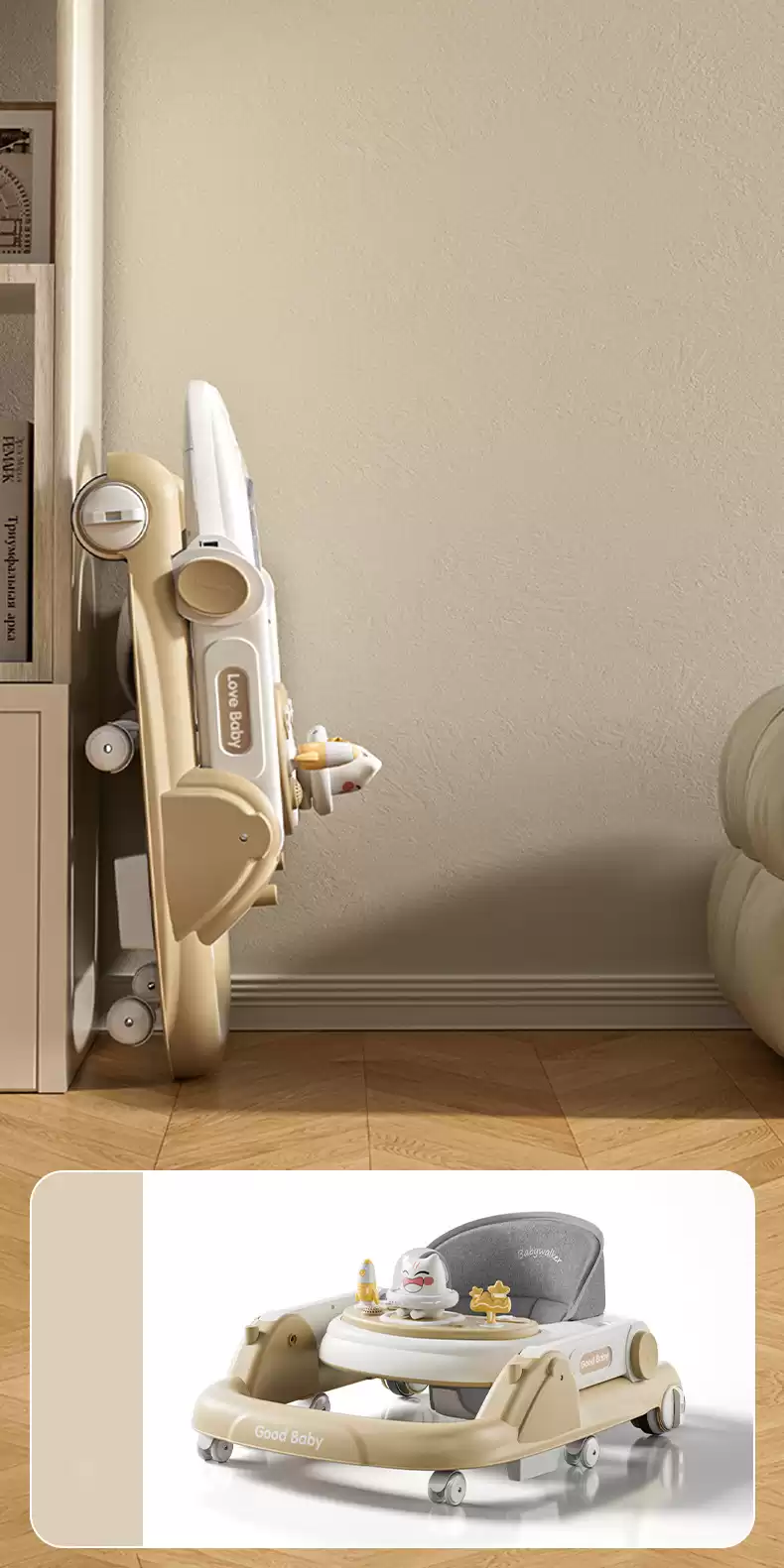 Когда кроха научится ходить, то будет уже самостоятельно толкать ходунки.