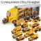 В набор входит 1 большой автовоз и 12 маленьких машинок спецтехники (самосвал, бетономешалка, бульдозер, погрузчик, каток, экскаватор).