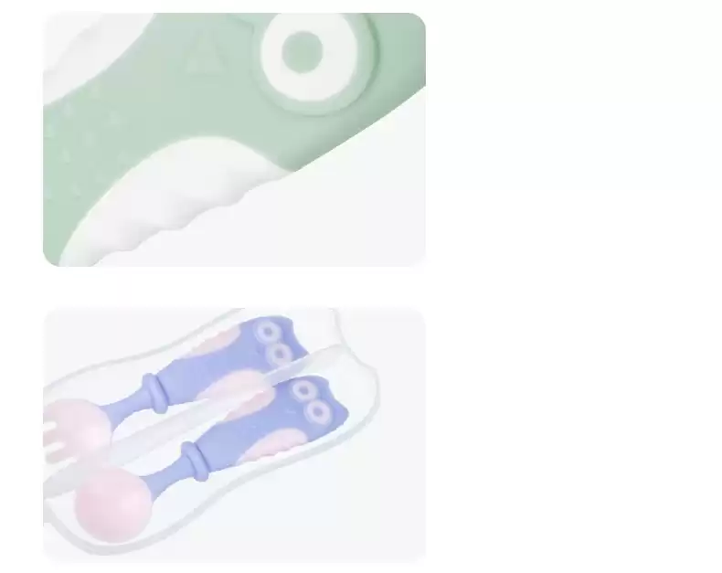 Набор hogokids начинает учится кушать самостоятельно. В наборе два прибора: вилочка с безопасными закругленными зубчиками и ложечка. Ручки столовых приборов имеют эргономичную форму, специальные антискользящие вставки и присоску. ОСОБЕННОСТИ: эргономичная ручка, подходит для маленьких ручек малыша; удобная форма ложечки и вилочки; набор для освоения навыков самостоятельного приёма пищи; изготовлен из прочных и безопасных материалов, не содержит Бисфенол А.